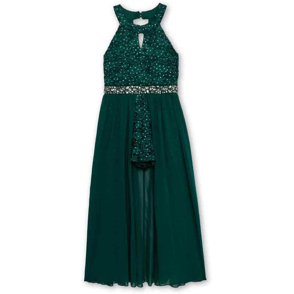 Speechless Girls’ High Neck Romper Maxi Walk-Through Party Dress(Emerald Green)