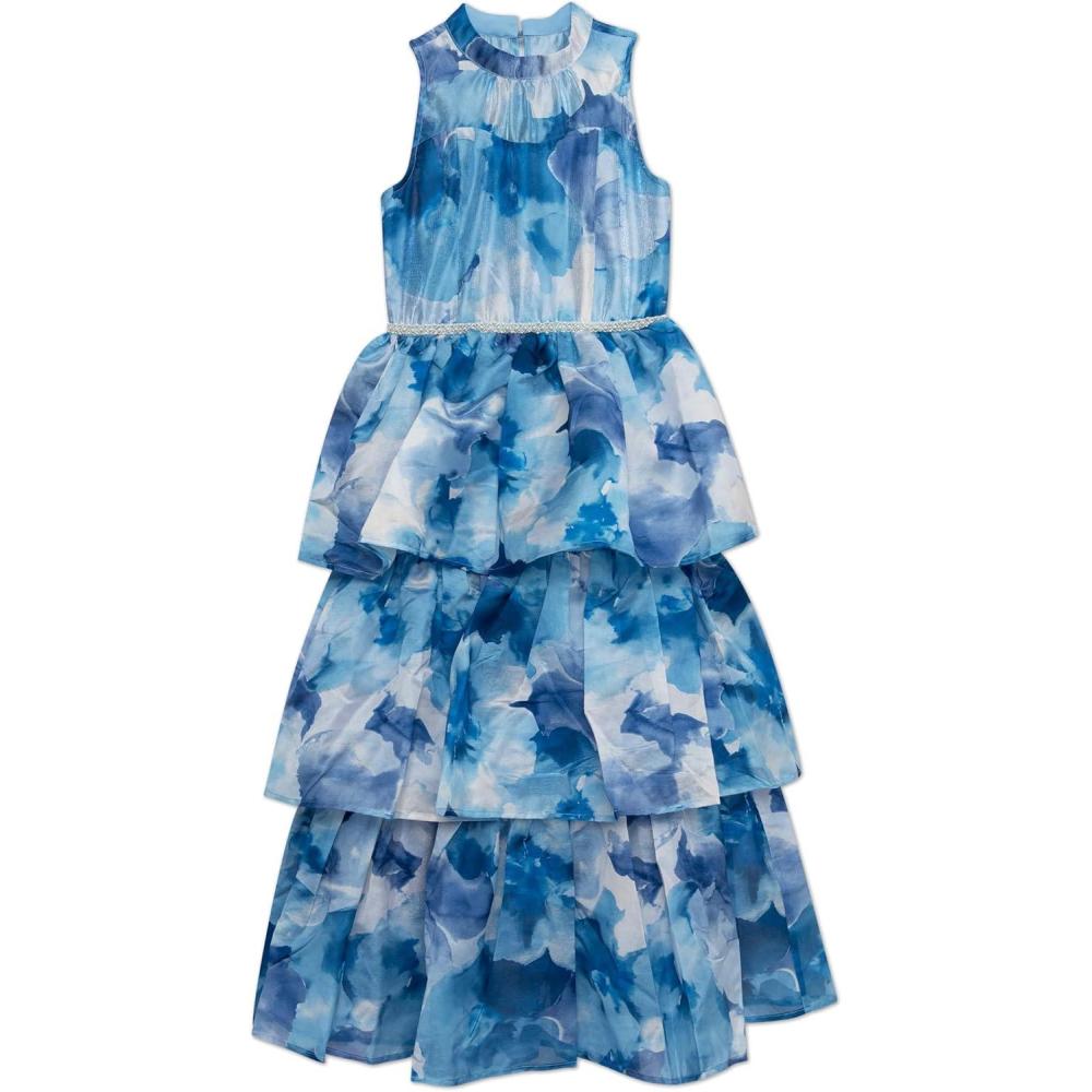 Make every special occasion unforgettable with the Speechless Girls' Sleeveless Maxi Length Organza Party Dress. Designed for tween girls ages 7-16, this elegant dress features a dazzling lurex organza fabric with a beautiful tiered skirt that flows gracefully with every step. The illusion neckline adds a sophisticated and age-appropriate touch, while the sleeveless silhouette allows for easy movement and comfort. Fully lined for a soft feel against the skin, this dress is perfect for weddings, graduations, recitals, family portraits, holiday parties, and formal events. The vibrant watercolor-inspired blue print gives a fresh and modern look, ensuring your girl shines wherever she goes. With timeless design and superior comfort, this dress is a must-have addition to any tween's formal wardrobe.