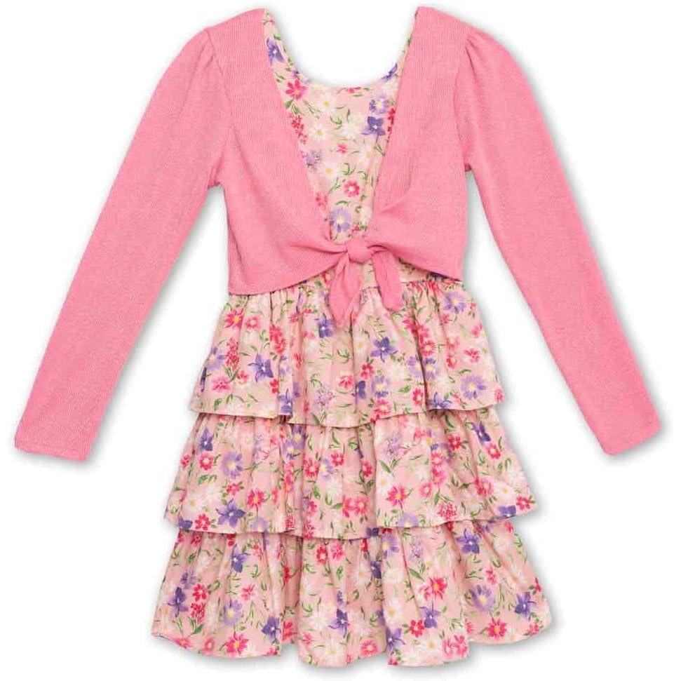 imageSpeechless Girls Sleeveless Tiered Dress and Tie Front CardiganCoralFuchsia Floral